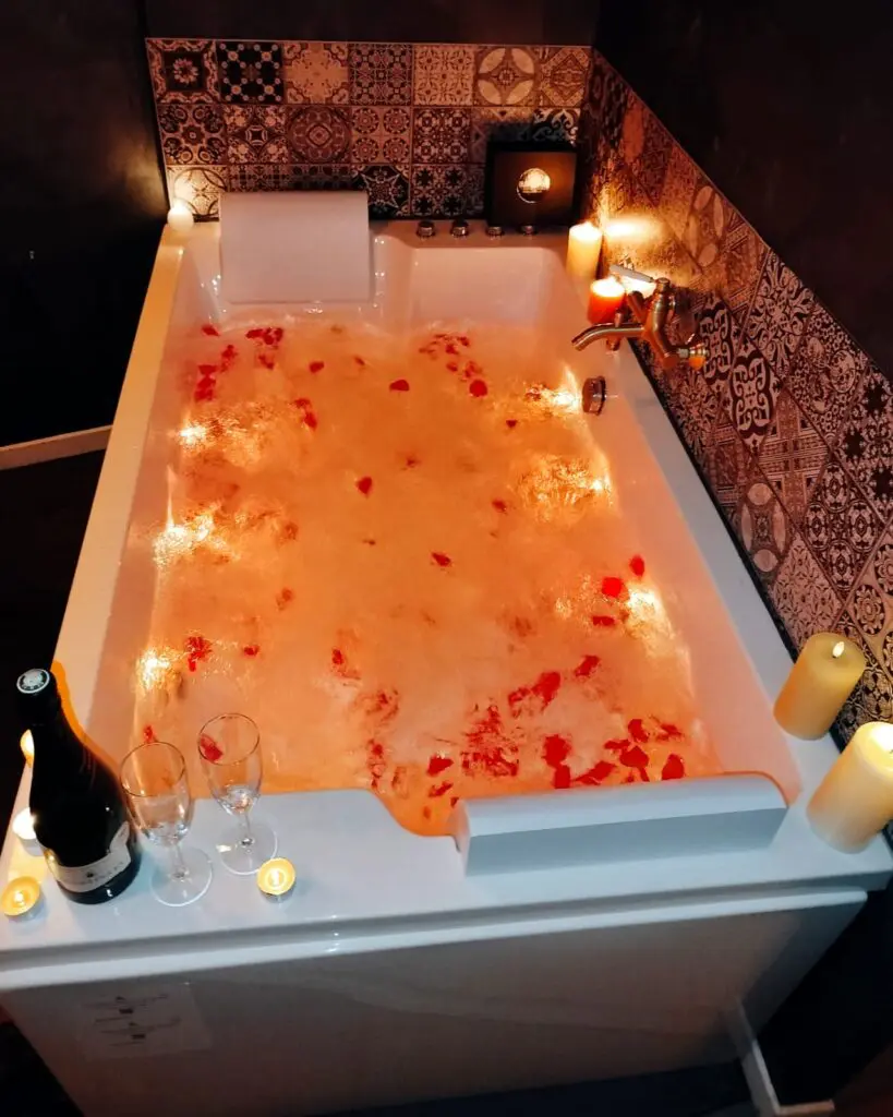 💎 Un havre de détente privatif : spa privatif aux bulles réconfortantes, éclairage tamisé, atmosphère chaleureuse… Imaginez-vous, verres à la main, profitant pleinement de ce moment hors du temps, porté par les jets relaxants.